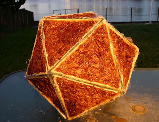 This masterful work of craftsmanship was created by an individual known by the pseudonym of turkey tek over at instructables.com. The pie is so named because it has the shape of an icosahedron, arguably the most beautiful of the five1 Platonic Solids (so named because of the Greek philosopher, not because the solids are just good friends). Even better, this isn't turkey tek's first foray into mathematically inspired baked goods: also on display is the formiddable Giant Fractal Pecan Pie.